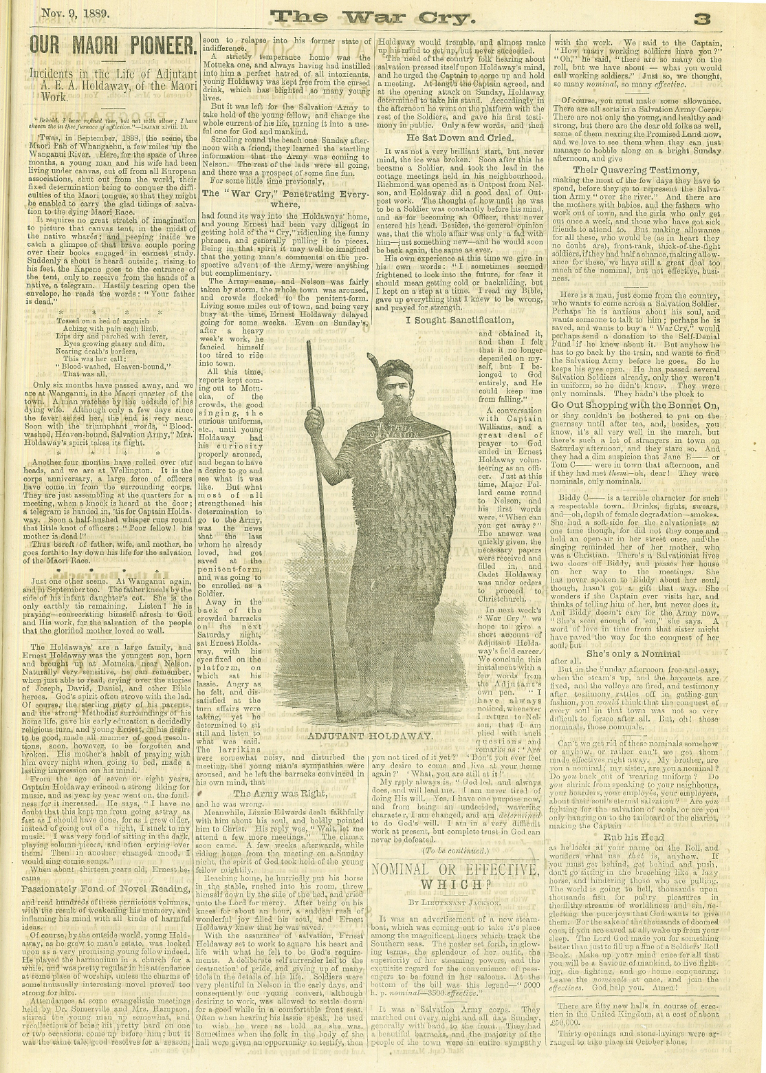 Captain Ernest Holdaway and wife Lizzie (Edwards) were married in 1888, arriving on the river in the same year. Holdaway contributed an autobiographical article in The War Cry of 9 November 1889, titled, ‘Incidents in the Life of A.E.A. Holdaway, of the Maori [sic] Work’ at ‘the Maori [sic] Pah [sic] of Whangaehu, a few miles up the Wanganui [sic] River. Here for the space of three months, a young man and his wife had been living under canvas, cut off from all European associations, shut out from the world, their fixed determination being to conquer the difficulties of the Maori [sic] tongue, so that they might be enabled to carry the glad tidings of salvation to the dying Maori [sic] race.’