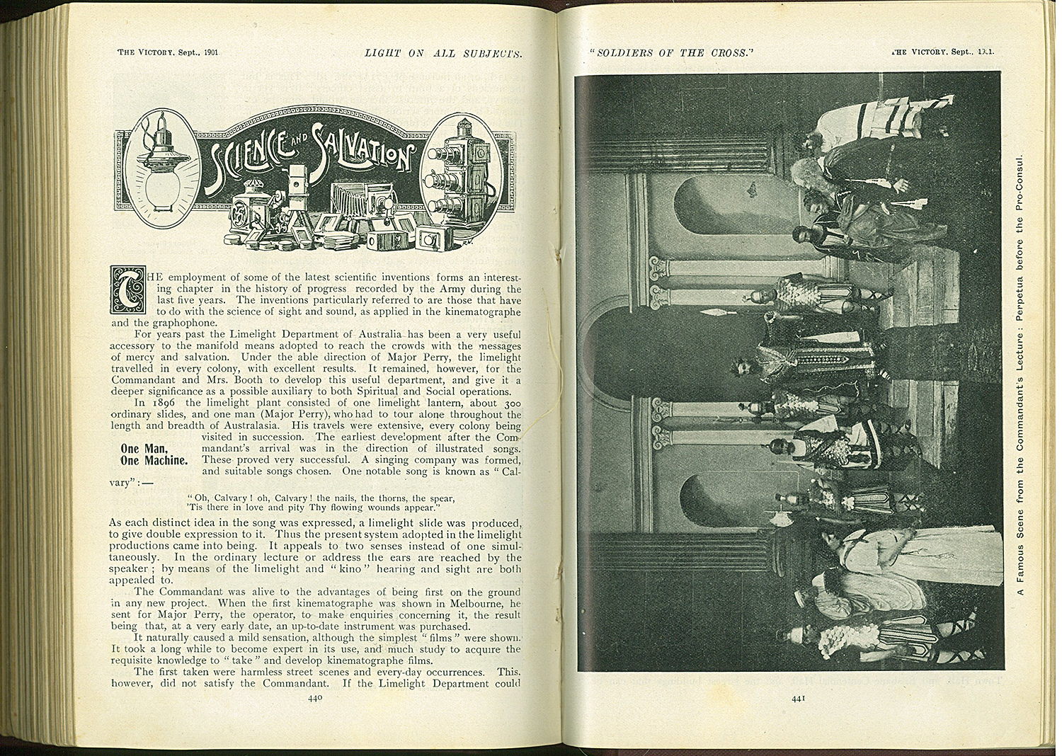 To add to the income of The Prison Gate Home, which supported men after their release from prison, Captain Joseph Perry established a photographic studio. This was a financial success and he purchased a lantern for limelight slide viewing. Major Frank Barritt when visiting the Ballarat Prison Gate Home was impressed and saw the possibilities of using the lantern in the salvation work. This projection medium was used by the Salvation Army in Melbourne as a kind of advertising agency for upcoming events. Regular lantern shows with religious and educational purposes ran in the city on a Saturday night.
